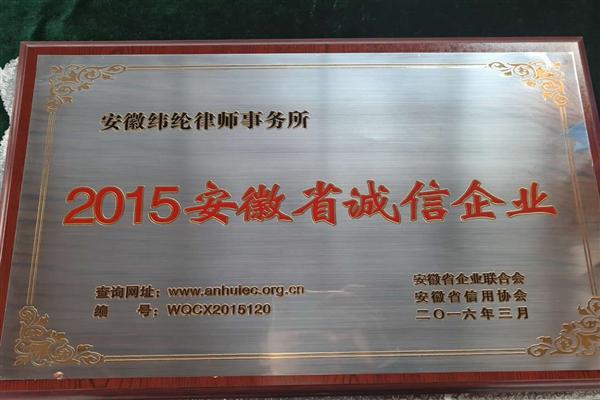 6年4月12日,安徽省企业联合会公布了“2015年安徽省诚信企业”名单,安徽纬纶律师事务所荣列榜单。本次评选工作是由安徽省企业联合会、安徽省信用协会组织开展,经省发改委、省经信委、省国资委等作为成员单位的安徽省企业信用评价委员会进行评审,并通过安徽经济报等媒体向社会公示。